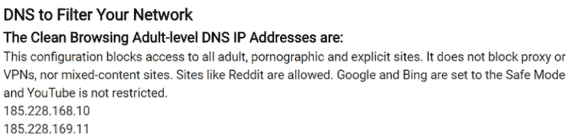 The OpenDNS Family Shield DNS will block adult content, including “Pornography,” “Tasteless,” and “Sexuality.” It will also block VPNs and proxy servers. It can also block phishing websites and certain types of malware.