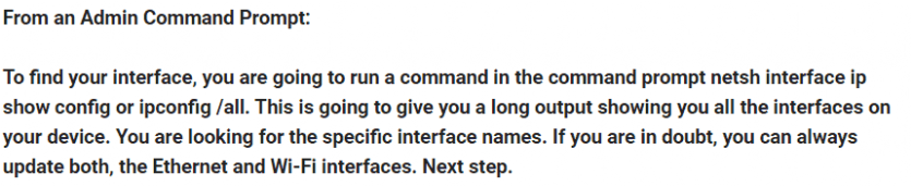 After finding your WiFi and or Ethernet names, from an Admin Command Prompt: